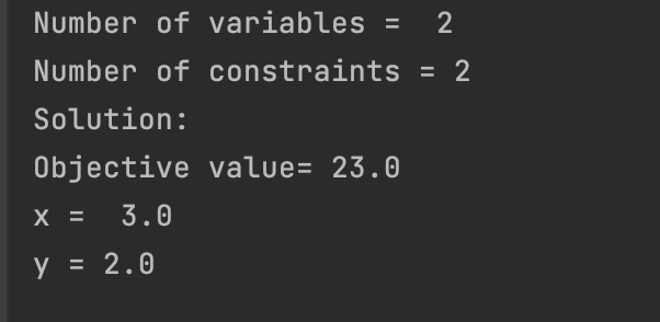결과적으로 x = 3, y = 2 지점에서 objective function의 optimal 값은 23이다.